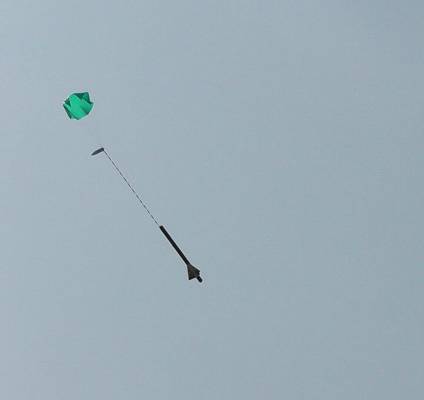 Ejection fired a bit early at 4.2 seconds, but it was near perfect for this flight, as the DEFCON only dropped 2 feet in the last 4/10 seconds before the parachute popped at 273 feet.  The color-coordinated parachute filled with air and the rocket came down at 8 mph, landing about 120 feet downwind. Total flight time was 27 seconds. A perfect first flight.  The altitude was lower than the kit card or the apogee website estimated, claiming 366 and 411 feet respectively.
