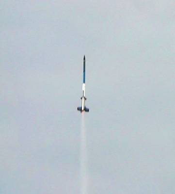 Tired of worrying about the erratic, gusty winds I decided to send this rocket up on a small A8, expecting about 100 feet. This rocket motor burned for 4/10 seconds and accelerated the Ricochet to a wind-defying peak of 14.9 Gs, averaging 5.2 Gs for the burn. It was then travelling at 50 mph straight up for the next 2.1 seconds to an altitude of 104 feet, turned over and lost only a foot when the ejection fired 3/10 seconds later. The descent was perfect with a good parachute (with a spill hole and extra-long shrouds), falling at 7 mph and landed within 50 feet for a flight time of 12.4 seconds. Another perfect flight.