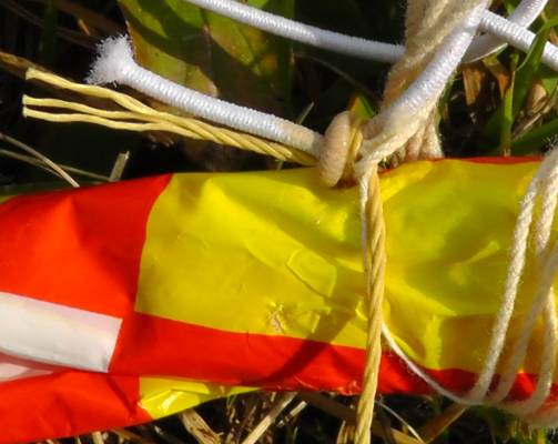 The parachute was pulled out of the rocket but never did open up. It was tangled in a mess of Kevlar and elastic cord, and a shroud line was caught in the very knot I earlier decided not to fix with a simple snip of the scissors. Without a parachute it fell at 16 mph, landing hard in the grass after a 15.6 second flight, about 250 feet upwind. It landed sideways and tried to break off two fins. The fins remained attached, but the glue fillet joints showed obvious cracks. These two fins will need to be removed completely and re-glued. A lot more trouble than a snip of the scissors.