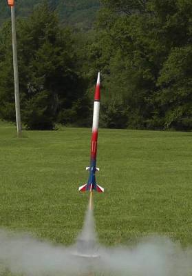 Eventually I got it on the launcher and fired it up. This motor burned for two seconds, about the same as Estes. Interesting though, it produced about twice the acceleration at 10.9 Gs than a typical Estes C6. The average acceleration for the entire burn was a lot less, and less than Estes at 1.2 Gs. The rocket reached a top speed of 53 mph, which was 18 mph less than the average Estes C6. It then coasted up to 242 feet and there the ejection fired late at 3.8 seconds. It continued up for another 12 feet and stopped at 254 feet at apogee.