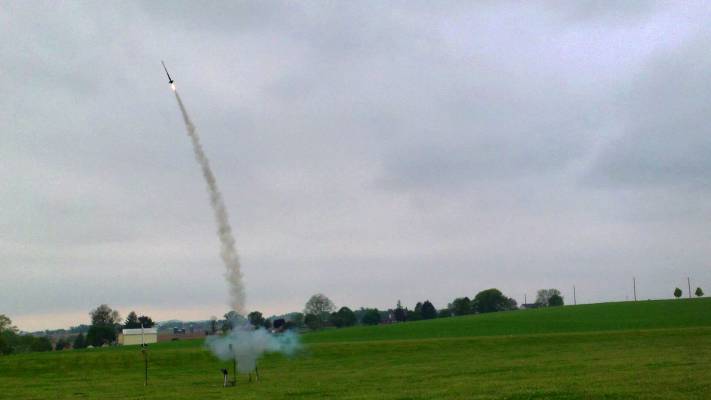 The engine chugged three or four times before a solid ignition, and then the rocket tore off the pad with a longer flame and denser smoke than any Estes black-powder engine I've ever used. It accelerated at a peak of 12 Gs, and averaged 5.4 Gs for the 1.4 second burn time. That acceleration was twice what I could expect from a B6 or C6 motor, but it is achieved at 3-times the cost. With that acceleration in light winds I expected very little weather-cocking, but this model turned and flew upwards at about a 30-degree angle from straight.