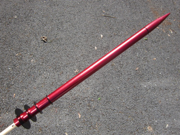 This treads a fine line between scratch and kit, I think. It's more or less a copy of a design by Gerald Wallace (Bohica) discussed here and here. Specifically his 13mm version, but mine has an 18mm motor mount; also I used one each 5055, 5060, 5070, and 5080 rings, which is what it says on his diagram, but in fact he used (for one version, at least) 5060, 5070, and 2 x 5080. It's not clear to me what Wallace used for launch lugs. I chose to put one 1/8" lug on a standoff near the center of gravity, high enough that the rod will clear the 5060 ring and go through 1/8" holes punched in the 5070 and 5080 rings. (Without a standoff, the two smaller rings would have needed gaps cut out of them, and I didn't like that idea.) Finish is Duplicolor Metal Specks red, rings are Rustoleum 2X gloss black, and there is a Testors trim tape line around the front end of the body tube.