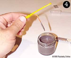 After selecting which lead length you are going to use, you are instructed to bend a 90 degree angle in the end of the igniter that has the bridge wire soldered to it. Photo 4 shows how this should look. This gives you a handle to hold onto the igniter and a way to lay it down after you have finished dipping it until it dries.