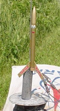 Finishing was handled in the simplest manner possible. Before attaching the fins I coated all three body tubes with thinned Elmer's Fill N Finish and sanded to hide the light tube spirals. This also has the added advantage of giving the fins a little something extra to bite onto when they're attached. After attaching the fins, they were also coated and lightly sanded, then the rockets were sprayed with a coat of white primer. The picture on the kit card showed the rockets painted yellow, but I thought a metallic finish would look better and went with metallic gold. This turned out to be a good alternate choice as it allowed the decals to stand out just enough while allowing me to use up some of the metallic gold that I had to buy for my daughter's social studies project. The water slide decals, which is how it SHOULD be, were sprayed with a thin coat of clear acrylic and attached as soon as they dried enough to wet them. They went on quickly and easily and were themselves the unifying thread that tied this group of rockets together as a family.