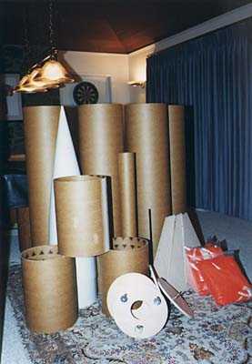 [Tubes] The kit included, four 4' body tubes, three 18" tube couplers, one 4' nose cone, three triangular fins, one 98mm motor mount tube, three 1/2" plywood centering rings, one 1/2" plywood bulkhead, three parachutes, and other hardware (not shown).