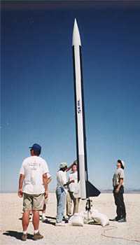 A year more experience, and particularly making more contacts with fellow rocketeers, allowed this launch to be much easier and more successful. Once the rocket was up all pictures were taken and the electronics were armed, it was back to 750 feet for the actual launch. The blast was thunderous and the rocket lept right off the pad, making a perfect flight.