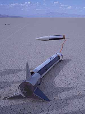 Rocket PictThe rocket came down safely about 500 feet down-range, but the landing broke the unreinforced PML phenolic in two places: right above the fin can, and near the forward end of the booster. The nose cone/payload section was unharmed.