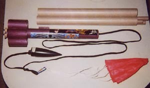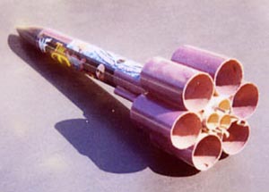 The Assembly Sequence: 1. I use 5 minute epoxy throughout, white glue optional 2. epoxy left, right tube fins to body tube, let set 3. epoxy 2 additional tube fins to the side, let set 4. turn assembly over, epoxy on remaining 2 tube fins 5. epoxy the 3 motor tubes to one another, let set (Estes-type motor stop rings and motor hooks can be attached if desired, in tube valleys only) 6. block the small empty spaces between the aft ends of the body and motor tubes with a little loose cotton mixed with epoxy or glue, to insure hull pressurization by ejection charges (see photo) 7. add soda straw lug 2" above tube fins, aligned with a portal between 2 tube fins (room for launch wire) 8. recovery system is 14" LOC chute on 7' of para cord