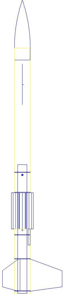 ![]() Infiltrator Rocksim Design FileThis was my entry in the Wildman design contest in August of 2011. It's designed to be constructed from Performance Rocketry fiberglass components. The design is inspired by the classic Estes Shadow and Optima kits. But, instead of the upper fins, the Infiltrator features a ring of tubes embedded in the main body tube. Standing over 6 feet tall, the Infiltrator streaks into the sky on a 54mm motor. Parts List: (1) Nose Cone - Fiberglass – 3:1 Ogive (1) Upper Body Tube – Fiberglass – 4" diameter, 36" long (5) Centering Rings – Fiberglass – 4" to 54mm (1) Lower Body Tube – Fiberglass – 4" diameter, 16" long, Slotted for three fins (1) Motor Tube – Fiberglass – 54mm motor, 32" long (7) Decorative Tubes – Fiberglass – 38mm motor, 9" long (3) Fins – Fiberglass - Trapezoidal Assembly: Glue one centering ring to the 54mm motor tube, 8.5" from one end. Glue another centering ring to the 54mm motor 14.5" from the same end. Let the glue dry. Slide the motor tube assembly into the lower body tube. Slide it in from the bottom with the upper centering ring (the one at 14.5") going into the tube first. Stop when the bottom of centering ring at 8.5" is aligned with the top of the slots in the body tube. Use a pencil to mark the inside of the upper body tube where the upper centering ring is located. Slide the motor tube assembly back from top (non-slotted end) of the lower body tube. Slide it back about half an inch. Use a stick to apply a ring of epoxy adhesive around the inside of the body tube where the line is marking the upper centering ring location. Slide the motor tube assembly back into place (again stopping when the lower centering ring's bottom is aligned with the top of the fin slots). Glue each fin in place in a fin slot. Do one fin at a time. After the glue is dry, use a stick to apply a fillet of epoxy to the edges of each fin where the fin meets the body tube. Let the fillets dry. Glue a centering to the bottom of the motor tube against the ends of the fins. Let dry. Glue the 9-inch 38mm tubes in a circle around the motor tube extended out of the top of the lower body tube. Each tube should rest against the top of the lower body tube. Let dry. Slide a centering onto the top of the motor tube until it rests against the ring of 38mm tubes. Glue the ring in place. Glue the last centering ring 1" from the top of the motor tube. Let the glue on the centering rings dry. Drill a hole in the upper centering ring and attach a screw eye. Attach one end of the shock cord to the screw eye. Feed the other end of the shock cord through the upper body tube. While avoiding getting epoxy on the shock cord, apply a ring of epoxy to the inside of the upper body tube then slide it over the two exposed centering rings until it rests against the 38mm tubes. Let dry. Attach the end of the shock cord to the nose cone. Attach the parachute. Glue the launch lug to the lower body tube, just below the ring of 38mm tubes, making sure that the launch lug is aligned so that the launch rod will go through one of the 38mm tubes.