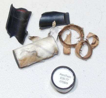 Attempting to launching a classic Colossus with an Aerotech E30 resulted in a CATO. Parts of the motor exited the back and side of the rocket.