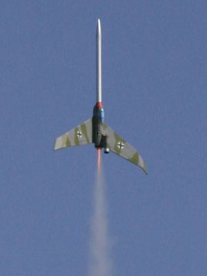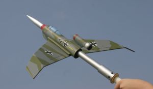This is a boost glider featuring a rear ejected pop-pod. Propulsion is handled by 18mm motors. Pod returns safely on a parachute, while the German themed plane glides on towards its secret mission. Manufacturer rates this at a skill level 3.