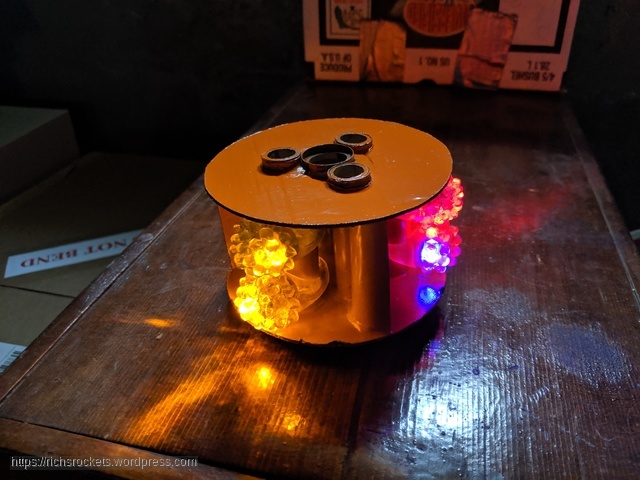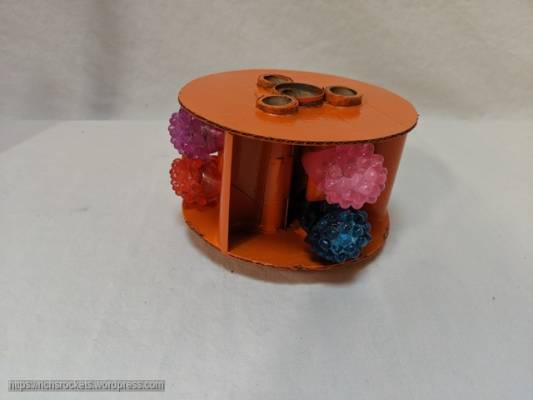 Based on designs by Joseph Peklicz in the #352 issue of the Apogee Peak of Flight newsletter. It’s a spool rocket with half pieces of tubing inducing a horizontal spin on recovery. Mine is designed so it can be flown clustered: there’s a central 24 mm motor tube with three 18 mm motor tubes arranged around it. No particular reason, just felt like it. Further from the center are the three half 24 mm tubes, and there are three 18 mm posts.