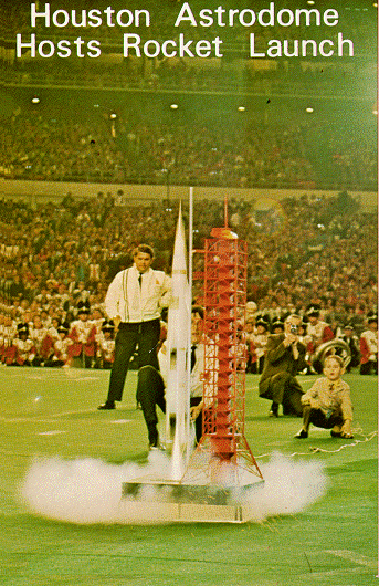 This is the photo from the cover of the March 1970 (Volume II, Number 6) issue of Model Rocketry Magazine. It shows the liftoff of the Saturn V launched inside the Houston Astrodome during the halftime show of the 1969 Bluebonnet bowl. The rocket used a special D motor produced by Estes to ensure that the rocket's maximum altitude would remain below the 194-foot ceiling height.