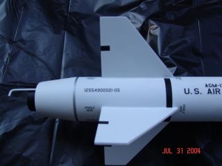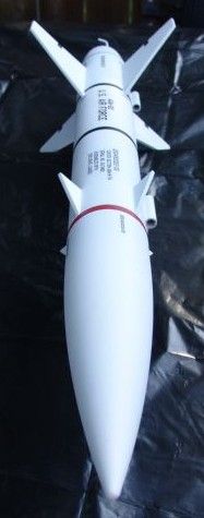 Applied 2 coats of Plasticote white primer and wet sanded the rocket smooth with 600 sandpaper. Then I sprayed 2 coats of Krylon flat white over entire rocket. Vinyl striping made the 1 red and 2 black stripes easy to apply as the decals were very good quality and went on with no surprises. Overall the finished kit is OUTSTANDING to look at. Now to put it up in the air.