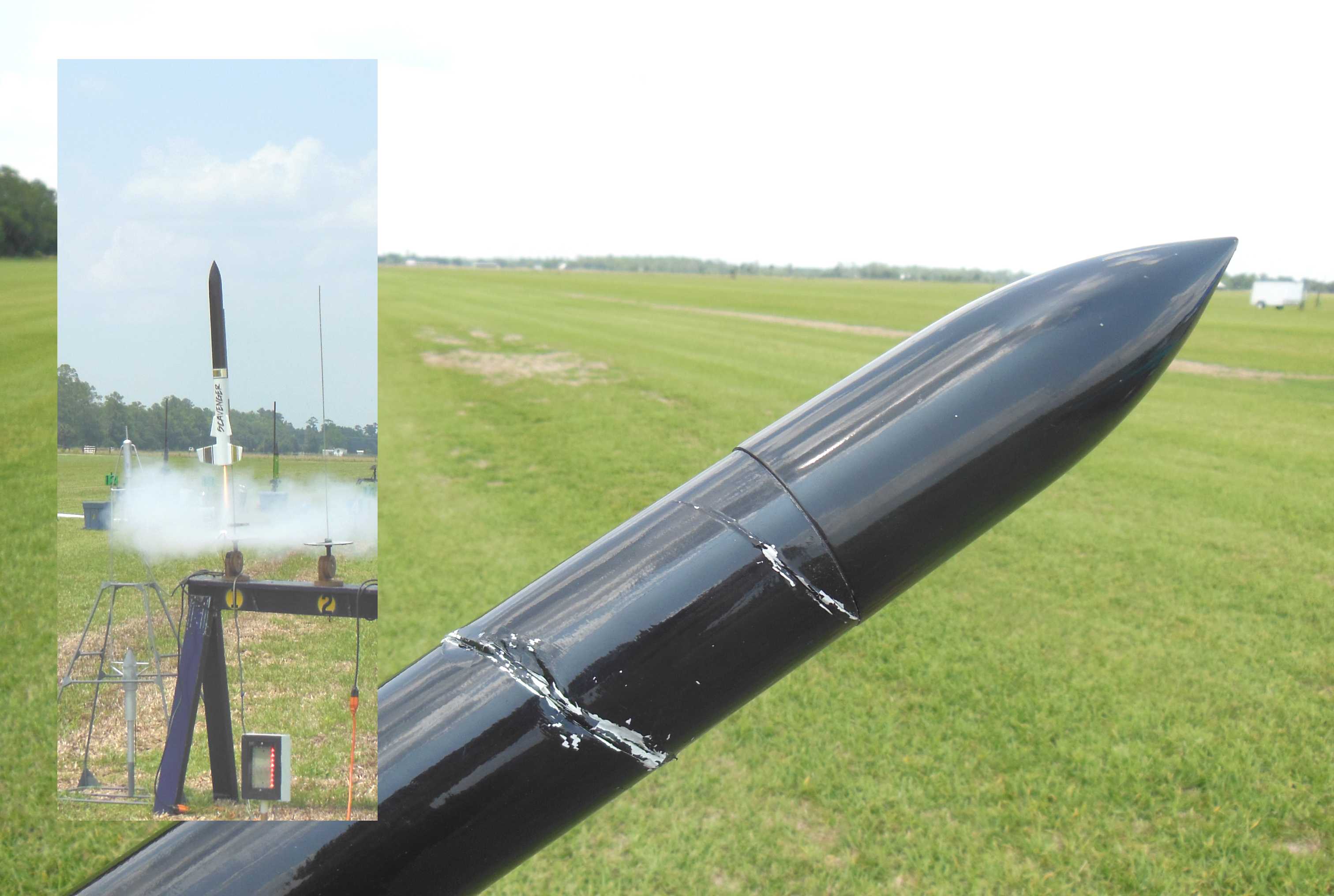 Only the nose cone blew off at ejection. That did slow it a bit, but it still nosed in and crumpled the first 6" of the body tube.