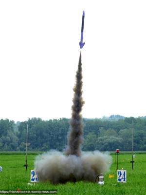 Next I loaded up the Scion with a CTI G88 Smoky Sam, delay drilled to 8 seconds. thrustcurve.org recommended 7, but my choices were 6 and 8 and I opted for longer. In fact 6 would have been fine. Recovery was with a 24″ chute bound up with a Jolly Logic Chute Release I’d bought an hour or so earlier. I still think the Chute Release’s price is too high, but what incentive do they have to lower it? From what I’ve seen they must be selling tons of these things. I decided it was time to give in and buy myself one. It worked great.