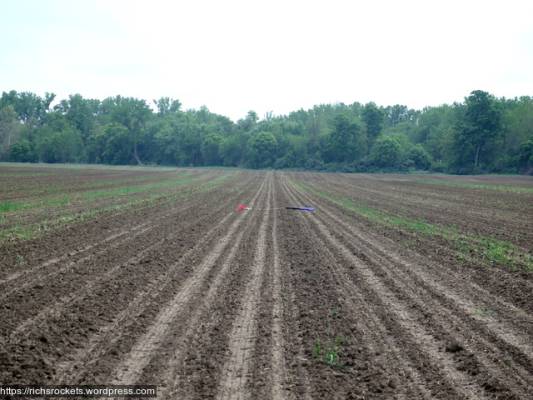 The motor didn’t explode. The fins didn’t shred. The chute release worked again. I nevertheless had a good long walk because for whatever reason the Scion decided to head off to the south under thrust, and it came down all the way across Big Tree Lane in the middle of a plowed and planted field. Considerably further than I thought it had gone (though I did think it was possible it had crossed the road) and if the crops had been high it would have been interesting trying to find it. As it was it was just interesting getting to it, crossing a ditch and some very muddy territory. My boots gained a few pounds. The rocket was fine though.