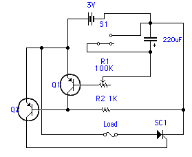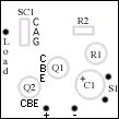 This is a very simple, yet effective timer based on a basic RC charging circuit. It will time for an interval of about 3 seconds up to about 20 seconds based on battery voltage used and components used. R1 sets how long the timer runs. For longer times, a larger capacitor can be substituted for C1. Any voltage up to about 12 volts should work fine with this circuit, although I have only tested it up to 9 volts. S1 is the trigger for the timer to start. The timer will start when S1 opens (it is normally closed). I use a reed switch on the body of the rocket that matches up with a small magnet on the launch tower/rod. When the rocket moves away, the reed switch opens, starting the timer. As long as S1 is closed, Q1 is saturated, reverse biasing Q2 and turning it off. When S1 opens, C1 begins charging through R1 and Q1. When it is fully charged, there will be no more base-emmiter current and Q1 will turn off. This will allow current to flow through R2 to the base of Q2, saturating it and turning SC1 on. This fires the ejection charge. Note that the load out on the PCB goes to ground when the circuti fires, so the ejection charge should be hooked up to the positive of the battery and the load output of the timer. Also note the oritentaion of C1 on the PCB and the orientation of the transistors. |
