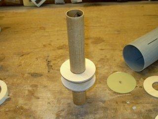 Next, I mixed up some West Systems epoxy and applied it around the inside of the body tube and motor mount at the end. I also applied some to the inside and outside edges of the laminated CR, then poured the rest inside the bottom well of the body tube. The laminated CR was inserted into the BT, then the Bt was placed upright on a table and pushed the bottom CR assembly flush into place. I cleaned up any excess epoxy, which wasn't much, with denatured alcohol, then rolled the body tube to make sure all the glue inside would produce some good fillets.