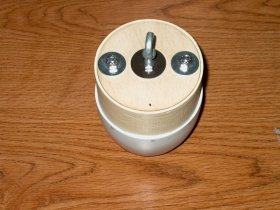 Now it was time to turn my attention to the camera. I used a 1/2" piece of wooden dowel, put it inside my drill press and used a combination of files to cur grooves in it to make the camera shaft. Notches were added to the sides for realism, then it was primed and hand painted in silver. The top of the camera was made from a piece of white plastic tube and died black using Rit Dye. I pressed it on the silver camera shaft, then filled it with 5 minute epoxy, creating a lens with the epoxy. A hole was drilled thorugh the two plates and the camera shaft and I used a 4-40 screw and epoxy to assemble the three pieces, along with the Phenolic sleeves. A CR was made for the 2" sleeve and glued to the sleeve, then the entire assembly was glued to the front plate inside the nosecone.