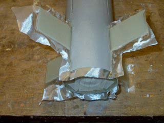 Rocket Pic I glued on the upper centering ring for the lower fins and the lower centering ring for the upper fins. This way I had access to both fin areas for mounting. The CR's were epoxied to the motor mount after carefully measuring their position. Next, I mixed up some West Systems epoxy and installed the motor mount. While I was at it, I took the top centering ring and added a slot for the 3/4" Nylon piston strap. Next, I glazed it with the remaining epoxy so the top CR would be waterproof and make for easy cleanup.