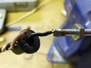 4. Strip and tin 1/8” of stranded wire and pass through the side of the channel in the Rawl nut and out the flanged end as shown. Solder the wire to the brass insert you have prepared.