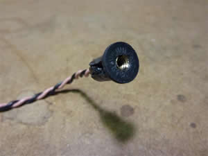 9. Hook up the other ends of your two wires to a continuity tester and insert the 6-32 x ½” pan head screw into your new switch. At first there should be no continuity until the screw bridges both brass inserts.