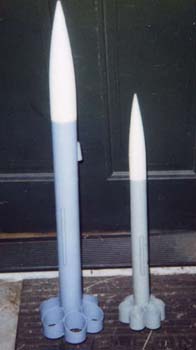 This design is actually a scaled-up version of my tube-fin modification of the LOC Aura (which I called Auracle), previously submitted to EMRR. I liked how easy to build and sturdy the original was, and how well it flew in wind. I built the larger version (using a 54mm tube as the airframe) as my Level One ship, thinking to fly it on an H128 instead of the E30-7 that flies the original (see photo). As it turned out, I wound up qualifying with my back-up L1 ship, a 4" 38mm Goblin built from the EMRR article, since a generous offer of an H73 came my way. Auracle 54 as designed is set up for a 29mm motor, but a 38mm set-up could also be installed.