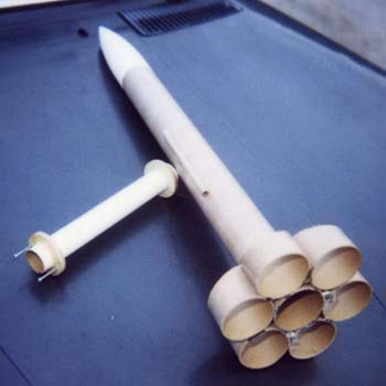 Auracle 54 is assembled from 54mm LOC tubing, the 6 tube fins having a 22.5 degree bevel top. Assembly sequence is exactly as for the smaller version, or any tube-fin rocket. The 13" 29mm motor tube is installed with 1/4" centering rings (photo). I originally used blind-nuts and washers for motor retention, but have since switched to an Aeropak retainer. An optional LOC 6" payload compartment (built from their bulkhead kit) for my PerfectFlite altimeter was built to interchange with the 54mm LOC nose cone (photo).