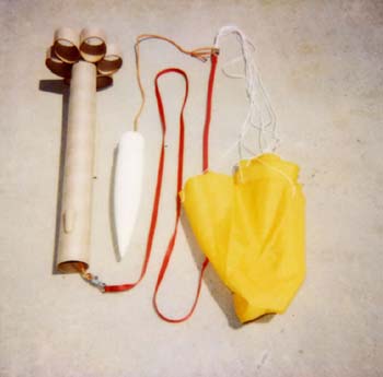 The recovery system used was fashioned from a PetCo 6' nylon dog leash with 18" of choke collar material attached via welded steel rings (photo). A 28" LOC chute attached with a mini carabiner completed the system. As in all my rockets, the recovery system is anchored to the upper body with a knot through the hull, covered with a plastic fairing (cut from a Garcia-Vega cigar tube). The 1/4" launch lug is glued to align with one of the spaces between 2 tube fins. The launch rod passed through both. Finishing was with Flat Gray aircraft primer and flat flat white for the nose cone/payload section. Final CG loaded with a G80 is 3.5" ahead of the tube-fin tops, and Cp is somewhere inside the fin can, so Auracle 54 is overly stable. The payload section version adds 85g of nose weight for flight with the H128 set-up.