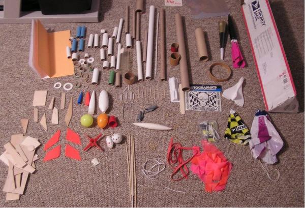 The upper body assembly is made up of: party horn, plastic fin can, nose cone, 5 tooth picks, launch lug assembly and BT60 tube.