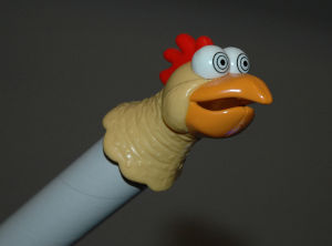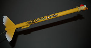 I had a ball building this. When I spotted the chicken novelty candy packet I thought 'rocket'. The paint job is a custom blended orange/yellow in an attempt to match the beak color. The fins were cut and painted to look a little like wings. It has a custom decal applied to the side, and the whole rocket was coated with a clear gloss finish.