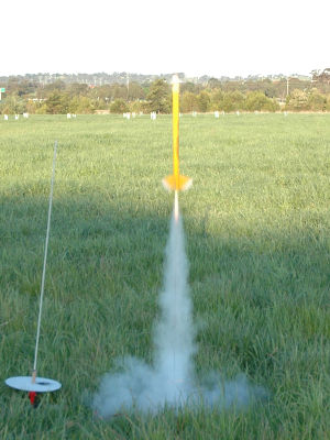 The Ballistic Chicken was flown on a B6-4. Nice straight boost to a couple of hundred feet. Three squares of recovery wadding was used to protect the 12" mylar chute. Descent was about right, and there was no damage upon recovery.