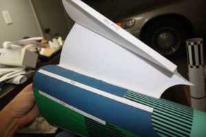 As the seam on the shroud began to set up, I began considering the fins again. Since the colored paper had been laminated onto the heavy stock with white glue, they were quite stiff; much more so than regular card stock. I began to form the first fin by trimming away all the material up to the folding tab on either side. I did leave the extension lines marking the fold location in place at this time, though. A long steel ruler was then taped into place on the back side of the fin with one edge aligned with the fold line. When I was sure that the ruler would not move, I used it as a stiff edge against which to fold the tab. The procedure was then repeated on the other side. The central fold was accomplished similarly and then the excess material was trimmed from either end.