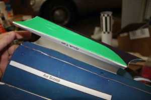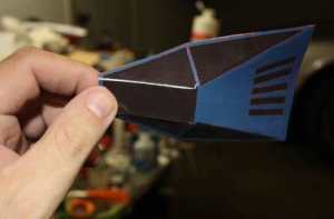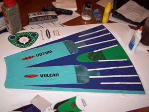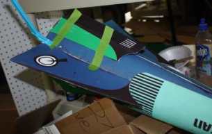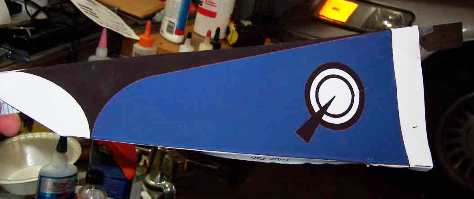 The vertical tail fin was applied in the same manner as the two wing fins. It was tacked into place with white glue.