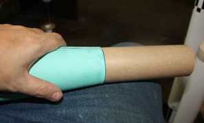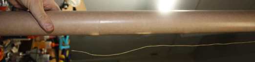 The next day, I tackled gluing down the middle portion of the shroud. I needed something besides me to hold it shut while the glue set. I decided to place the glue and press the sides together. I then let them "expand away from each other for a few moments while I got set up for my next step. I had a long wooden dowel, bigger than a BT60 but smaller than a BT70 and pushed that through the inside of the shroud from one end to the other. I then laid a piece of 1x4 along the seam on the outside. Clamps were used to hold the 1x4 to the dowel and keep the middle pressed down.