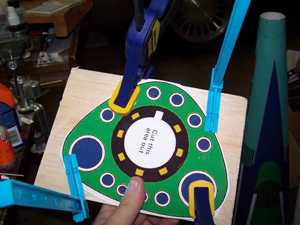 For the after bulkhead, I used a piece of 1/4" balsa. I cut the cardstock bulkhead out and smeared some white glue along the back. I then placed it on the balsa and applied some clamps to keep it from curling. When the glue was dry and the clamps removed, I still had quite a bit of material to remove. When I built my BT60 clone of the Vulcan, I removed most of that with an X-acto and then finally remembered the belt sander when there was not too much left to do. This time, I went straight to the sander and, for some reason, noticed the disk and decided to give that a try. It was the right choice. I could set the piece on the little shelf and gently feed it into the disk sander, stopping when I got to a line. It was the best one of these things, and the easiest, I had produced to date.