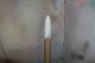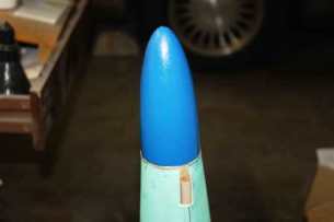 The NC having had a day to dry and been sanded was taken to the booth and given 2 coats of blue. When dry, the painted cone was tied into the elastic of the shock cord and fitted for the first time into the body.