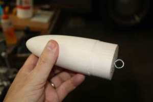 Whereas in my previous BT60 upscale of the Vulcan, I had just used a plastic Estes nose cone that was "close enough", this time I wanted to do it right. I contacted Gordon Agnello of Roachworks and he turned a custom balsa cone for me. It was beautifully done and, being justifiably proud of his work, it had his signature on the tail end. I hardened and sealed the NC by drizzling on a coating of thin CA and letting it harden. When hard, I gently sanded it with some #400 sandpaper.