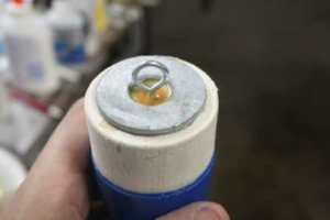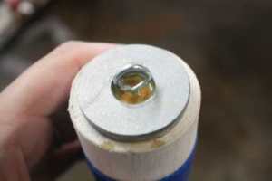 A ring of yellow glue was then swabbed around the cut end of the body tube and the baffle was inserted. When the glue had dried sufficiently, another ring of glue was applied in the end of another BT70 tube and the 2 tubes were joined together.