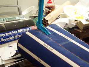 Allowing the CA to fully cure on the nose cone let me turn my attention back to the installation of the fins. The first had already been tacked on and now it was time to do the same with the second one. Again, white glue was used at this stage just to get the fin into place.