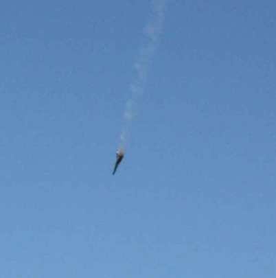 When I got things set up at the pad, I warned everyone that this was a heads up flight. It looked good sitting there and I was eager to press the button. At ignition, it was looking good. All 7 motors seemed to have lighted off and the Big Blue Vulcan rose off the rod. The flight looked good early on. Their was no wobble as is common with my original Vulcan or my BT60 upscale. It did, however, begin to tip over. This occurred during the powered phase of flight. I got a sick feeling when I decided that it was definitely pointing downward and I could still see flames coming out of the motors. When the motors did burn out, I waited anxiously for the ejection charge to save my months of work. I wondered if maybe some C6-45s had been labelled as C5-3s and it kept plummeting downward. It then disappeared behind the GSE truck and I was delighted to hear Todd exclaim that he had seen a good ejection. He neglected to mention immediately that the ejection took place AFTER impact with the ground.