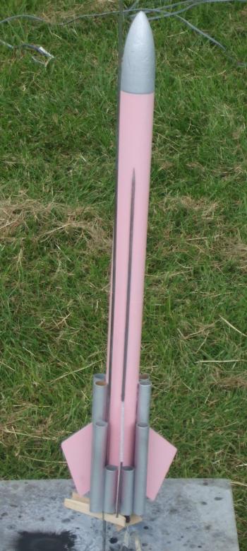 Firstly I designed the style of fins I wanted. These can be seen in the photos, two fins being 1 cm smaller overall than the other two. I then used my small tubing to measure four evenly measured lengths. I then recorded this length and added 2.5 cm on the length and measured another 4 small diameter tubes. I then measured another four tubes with an extra 5 cm onto the original smaller tube’s length. I then joined them together by curving them around the body of the rocket, smallest to largest. Two will have to have the same orientation, whereas the other two will have to be placed around the rocket differently, so make sure they will fit when attached. Do this for the remaining three sets of tubes. Attach the fins, smallest opposite each other and largest opposite each other. Then attach the sets of three tubes, smallest tube placed against the largest fin. Repeat this until all sets of tubes have been fitted and fins are intact. Use two equal length skewers and attach to the side of the body tube in line with the small fin on both sides. Attach parachute in the usual manner and paint as required.