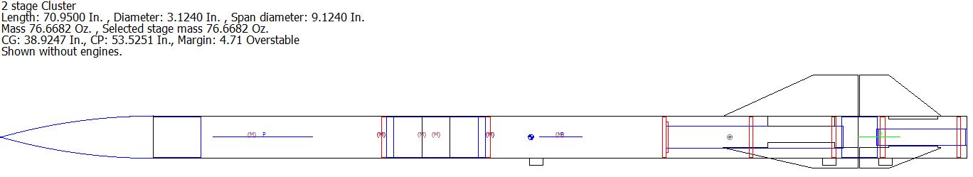 This is a 2 stage rocket design of my own all made from 3” Blue tube. The First stage booster has two 29 mm engines and the 2nd stage has a 38mm engine. It’s duel deployment running a Raven 3 with a RockeTiltometer , all that in a 3” tube is a lot but can be done by using both sides of the sled. This is quite the most complex rocket by far I’ve built. I’m finding out that Rocksim is having a hard time with the booster. When unloading one engine it still shows me the results as if both were loaded and I can’t get a good feel for what loads would be safe if 1 didn’t light. I Finally decided that I’ll use 2 CTI G250 two grain VMAX motors in the booster and Aerotech H245 in the second stage. I’m going to fly it without the booster first with a I218R to make sure it flies straight and we’ll go from there. Pucker factor should be high!