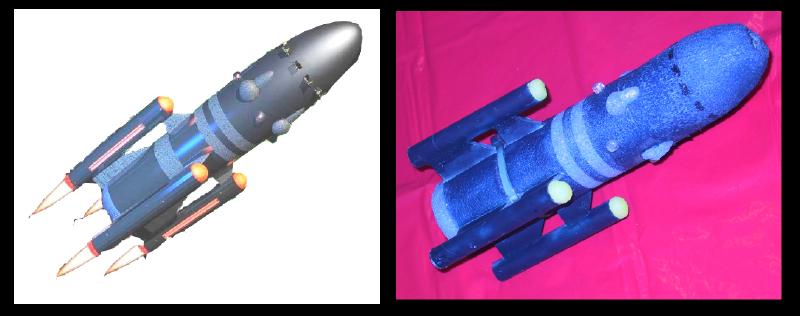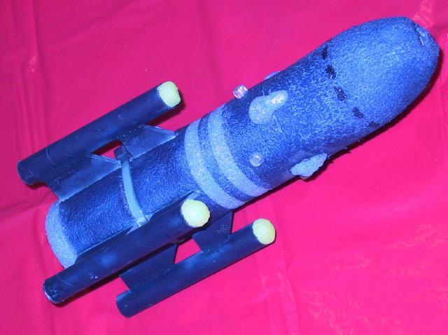 The design reference photo shows additional details attached to the forward section of the bullet shaped airframe. Additional core samples of blue foam noodle were shaped and glued onto the foam airframe to approximate those doodads. Clear plastic beads were hot glued to the airframe to represent navigation beacons. A marker pen was used to add additional details for hatches and seams.