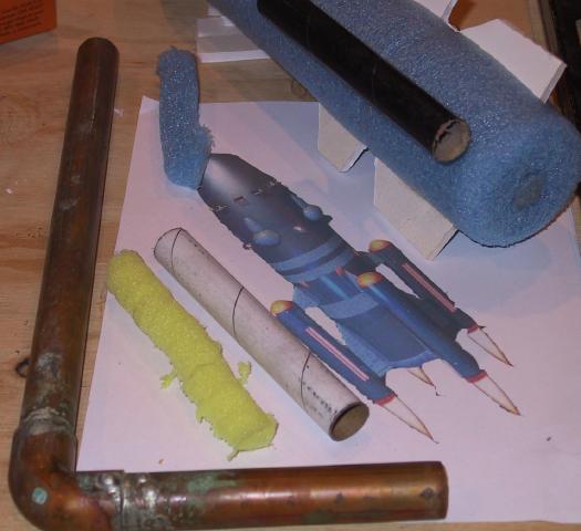A yellow foam swim noodle donated core samples that were trimmed and heat glazed to form the engine pod forward tips. Appropriate nose cones or paper wadding can also be used as options for plugging the forward ends of the engine pods.