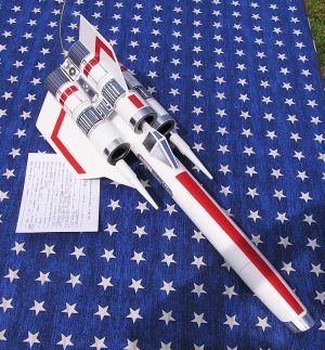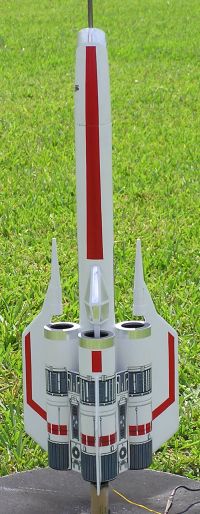 (Scratch) Colonial Viper Second flight was a couple months later at our usual THOR field, and I sent her up on an AT G64W-7. This load sims good with plenty of speed off the rod, but in reality it seemed to be somewhat underpowered. The Viper took off in a hurry but showing all the characteristics of the Estes original, cork screwing quite a bit on the way up. Ejection was a tad late (should have drilled the delay down to 6 seconds) resulting in an inch long zipper that was easily repaired.