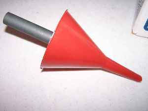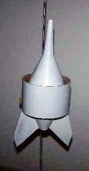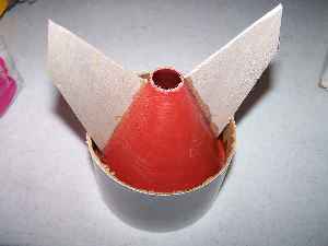 For the cones on the ship I ended up using 2 3.5" funnels. Stupid, I know...but it was all I had available. I cut a 2.5" section of 4" LOC tube for the center band. I cut a section out of that tube so it would fit snuggly around the funnel edges. The motor tube is a 6" BT20 with an engine block in one end and epoxied to the top half. I cut off the narrow part of the bottom funnel, and the motor exhaust can exit cleanly.I drew a fin pattern on some leftover balsa from an estes kit, and cut out two fins. Fins are epoxied to the bottom funnell, and the bottom funnel is epoxied inside the center band.