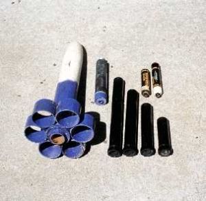 Da Bomb is a tubefin built from 2.6" (65mm) PML phenolic tubing. Don't bother starting this project if you're not going to glass the outside of the fins per the instructions--phenolic shatters like fine china without glassing. Rest of the parts include an Estes Fat Boy nose cone, a piece of 38mm motor tube, and foamboard for the centering rings to test another idea I had. Da Bomb is as small and cheap to build as an Estes Big Bertha (see photo), but it flies on I motors vs a C6-5!