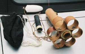Stuffing big APCP motors in Estes rockets and the like is a time honored part of our sport, but it usually involves complicated modifications to hold these things together. Da Bomb is not complicated at all. In fact, it's very conventional. Body tube consists of 15" of 2.6" PML phenolic, six tube fins are 2" long pieces cut from the same tubing. The 6 tube fins are glued in the usual self-jugging fashion (for tubefins) to the bottom of the body tube in pairs set 1/4" up from the bottom. I use cans of soup to hold the fins in place while the glue dries (I used 5 minute epoxy throughout). First two fins glued on left and right, then two more on top, followed by turning over the assembly two glue the last two in place. Airframe is now basically done (why I like tubefins). An 8" length of LOC motor tube is cut and centering rings are "hogged" out of 1/4" foam board. "Hogged" means crudely cut (with an X-Acto blade in this case) after drawing the pattern right on the material. I made 4 of these centering rings, doubled them with epoxy, and then glued a 1/32" ply duplicate on top of each stack for stiffness. (I like 1/32" ply as it cuts with a plain scissors like paper.) The resulting 1/2" thick centering rings were glued 3/4" from each end of the top and bottom of the 8" motor tube. The motor tube assembly was then slathered with epoxy and glued into the body tube. Recovery system attachment is a 4" knotted loop of para cord passed through an 1/8" hole drilled 2 1/2" from the top of the body tube with the external knot then covered with a simple fairing I cut from a Cheerios box and covered with epoxy. I usually use a piece of plastic cigar tube for the fairing, but I was out and the liquor store was closed. Recovery system consists of 8' of para cord attached to the loop and to the Estes Fat Boy cone with a loop 1' from the top for a 28" nylon parachute. A second hole was cut in the Estes cone and the para cord looped through these holes to avoid the useless molded in ring on the cone. For HPR flights (H-I), 70 grams of lead fishing sinkers were added to the cone and held in place with lots of wadded up toilet paper. For F-G flights, no ballast was used. The launch lug was a 1 1/4" piece of a ballpoint pen body big enough for a 3/8" launch rod glued with its center 4" above the fincan and exactly in line with one of the triangular holes between two adjacent tubefins (the launch rod passes through this triangular hole). I attached the launch lug on the side opposite the recovery anchor fairing. Lastly, the outer surface of each tubefin was reinforced by glassing on a small rectangle of glass cloth cut to fit and any excess fiberglass was trimmed off.